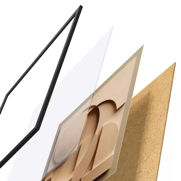 Das Poster besteht aus einem Rahmen, Plexiglas, einem gedruckten Bild und einer Rückwand aus Spanplatten. Dank der Halterungen auf der Rückseite kann das Poster sofort an die Wand gehängt werden.