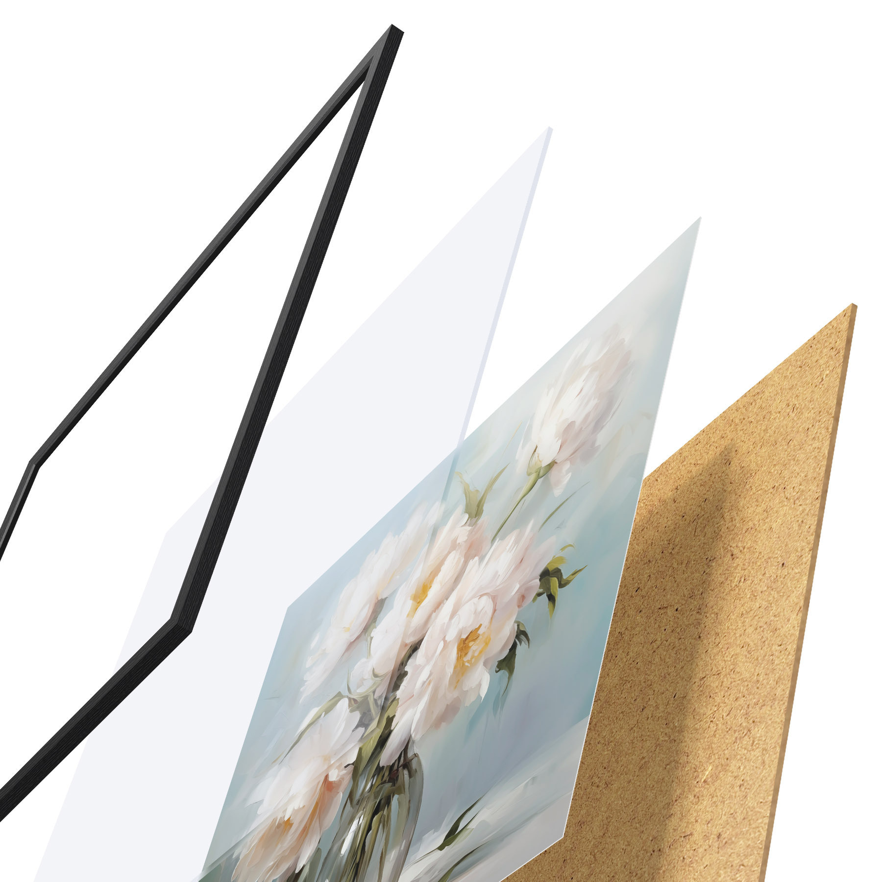 Das Poster besteht aus einem Rahmen, Plexiglas, einem gedruckten Bild und einer Rückwand aus Spanplatten. Dank der Halterungen auf der Rückseite kann das Poster sofort an die Wand gehängt werden.