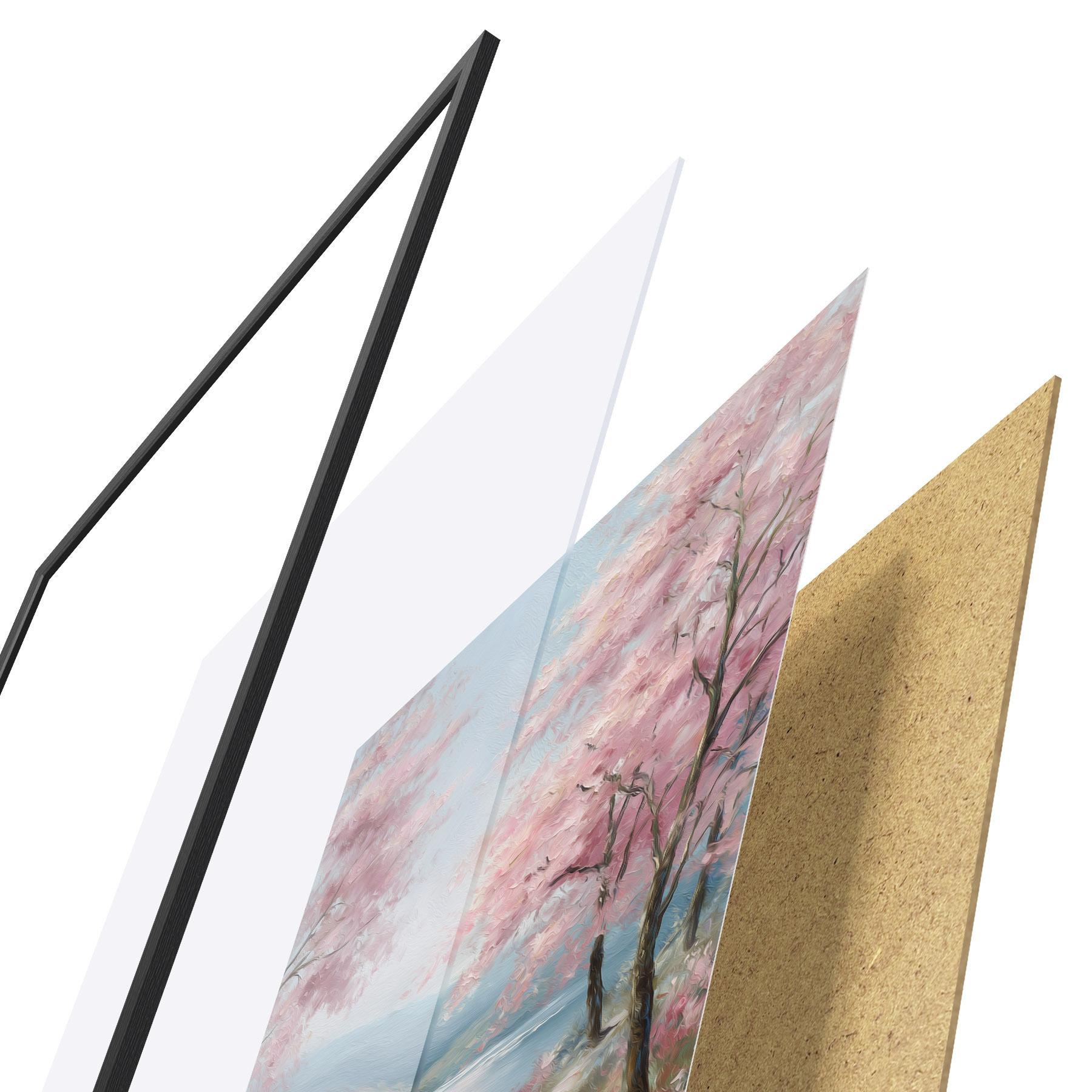 Das Poster besteht aus einem Rahmen, Plexiglas, einem gedruckten Bild und einer Rückwand aus Spanplatten. Dank der Halterungen auf der Rückseite kann das Poster sofort an die Wand gehängt werden.
