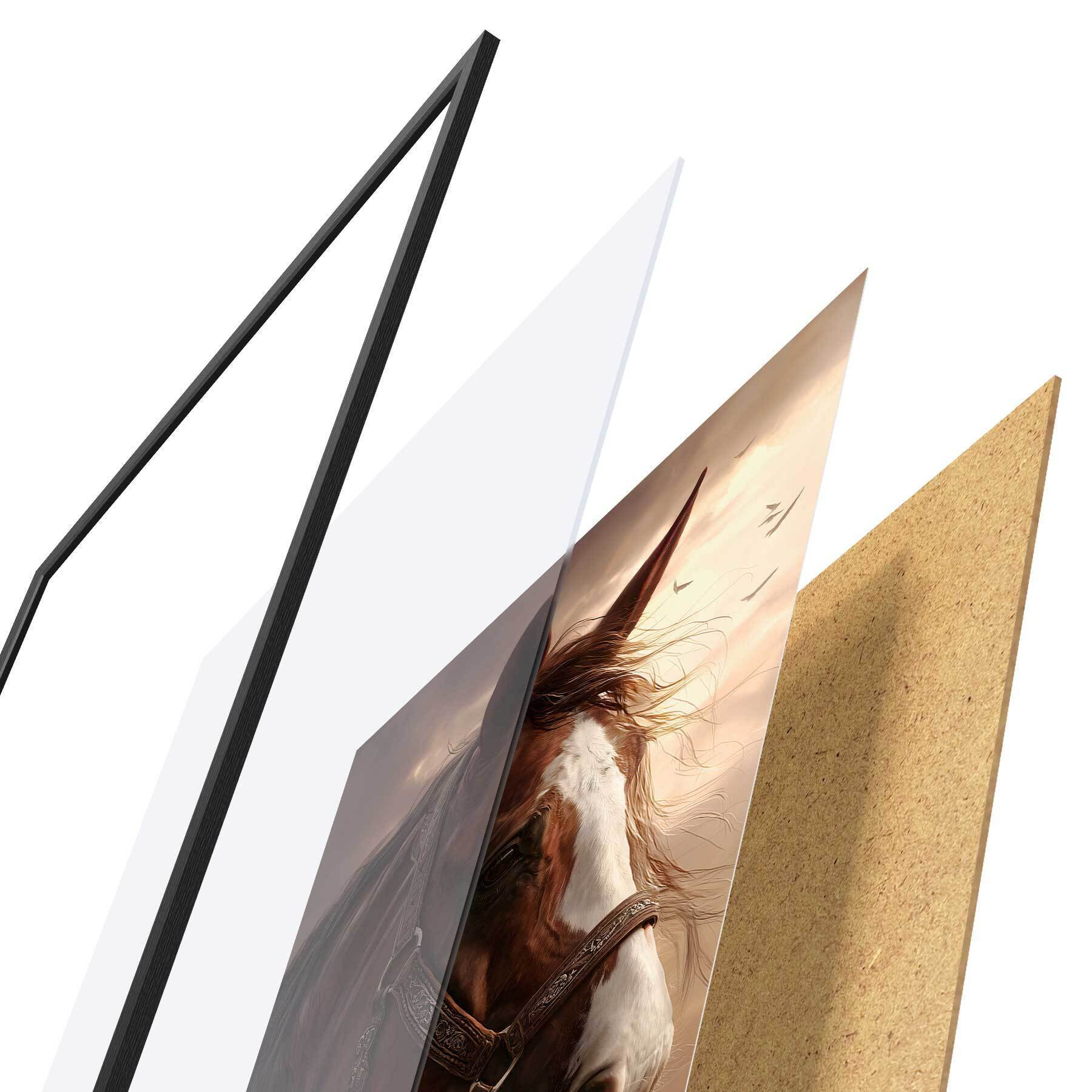 Das Poster besteht aus einem Rahmen, Plexiglas, einem gedruckten Bild und einer Rückwand aus Spanplatten. Dank der Halterungen auf der Rückseite kann das Poster sofort an die Wand gehängt werden.
