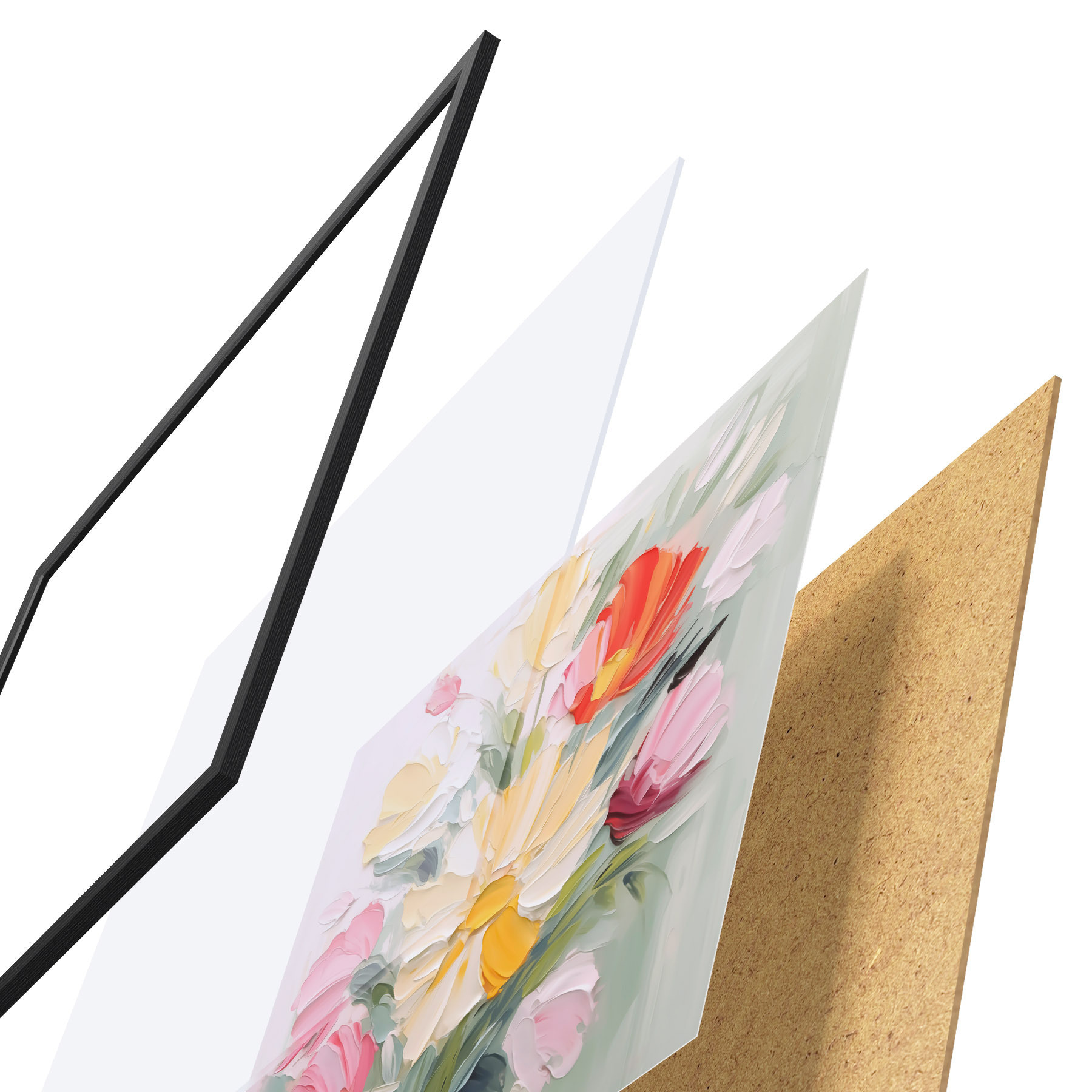 Das Poster besteht aus einem Rahmen, Plexiglas, einem gedruckten Bild und einer Rückwand aus Spanplatten. Dank der Halterungen auf der Rückseite kann das Poster sofort an die Wand gehängt werden.