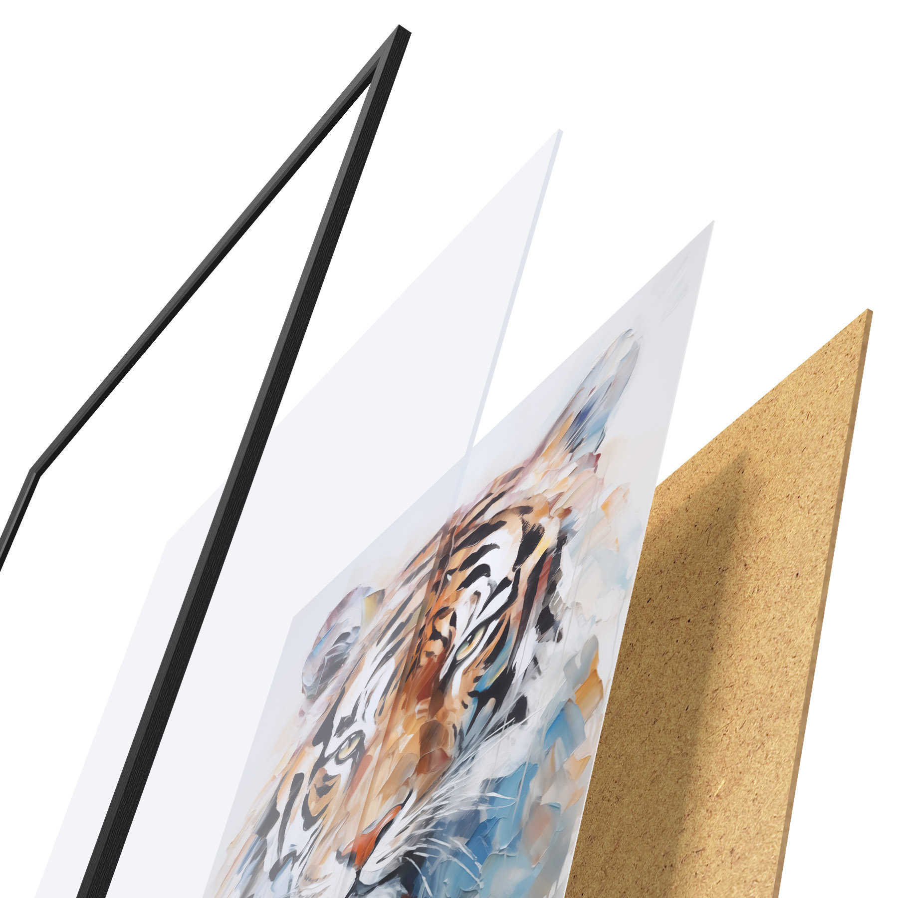 Das Poster besteht aus einem Rahmen, Plexiglas, einem gedruckten Bild und einer Rückwand aus Spanplatten. Dank der Halterungen auf der Rückseite kann das Poster sofort an die Wand gehängt werden.