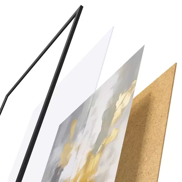 Das Poster besteht aus einem Rahmen, Plexiglas, einem gedruckten Bild und einer Rückwand aus Spanplatten. Dank der Halterungen auf der Rückseite kann das Poster sofort an die Wand gehängt werden.