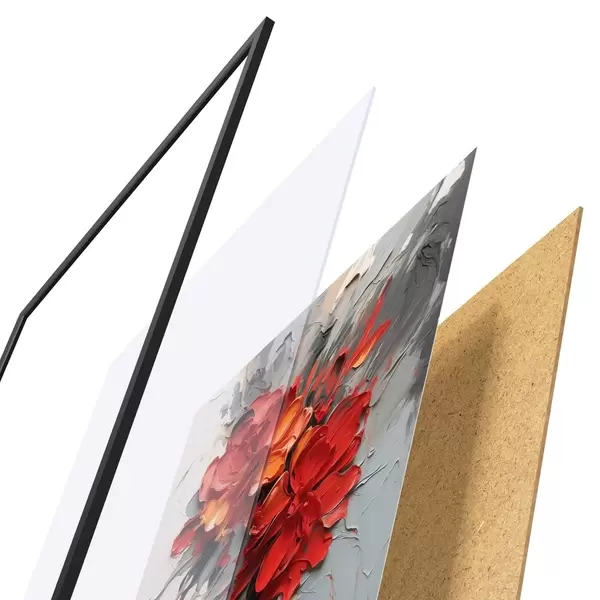 Das Poster besteht aus einem Rahmen, Plexiglas, einem gedruckten Bild und einer Rückwand aus Spanplatten. Dank der Halterungen auf der Rückseite kann das Poster sofort an die Wand gehängt werden.