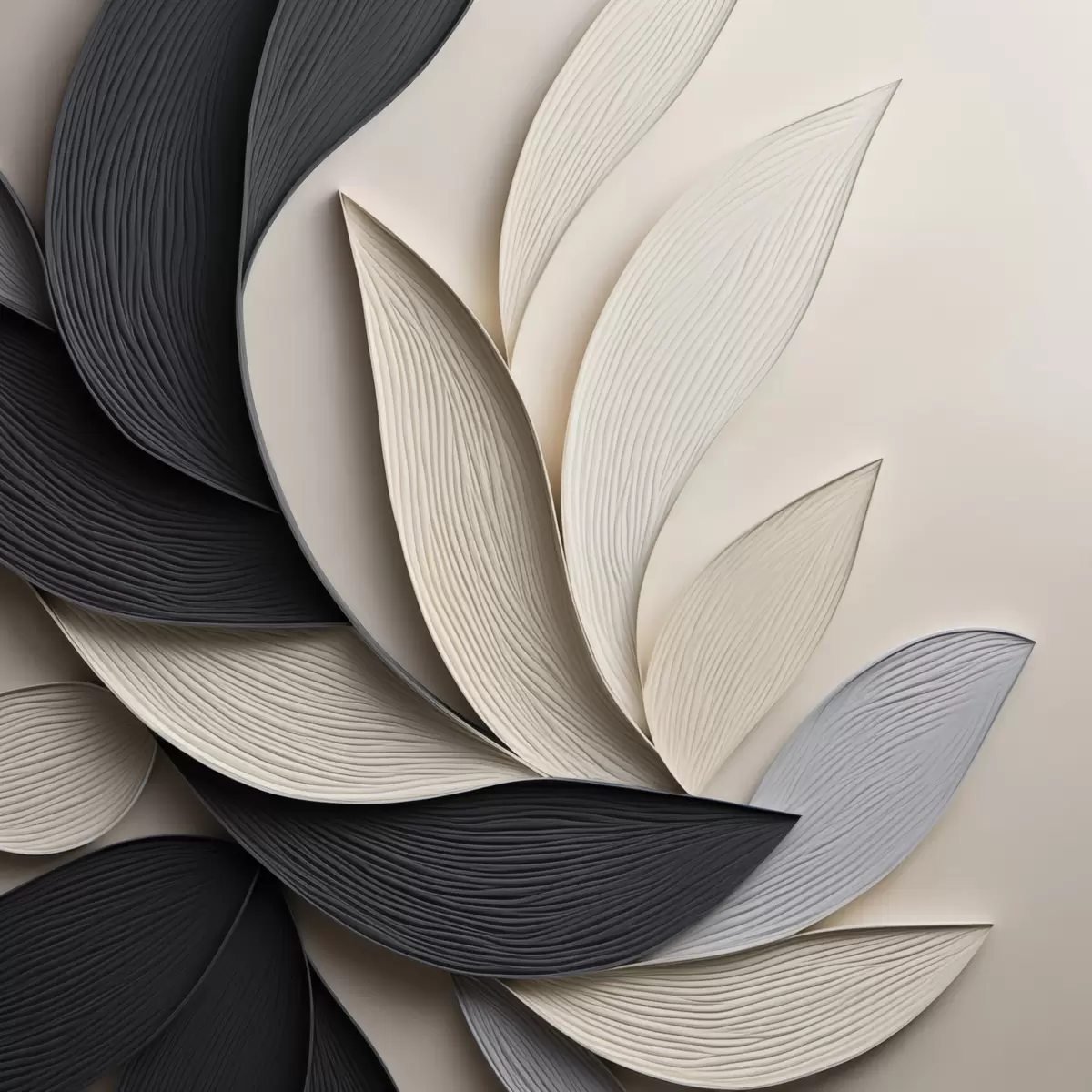 Poster Abstrakte Komposition aus übereinanderliegenden Blättern, geschwungenen Formen in Schwarz, Weiß und Beige, strukturierte Kunst Nr f48381