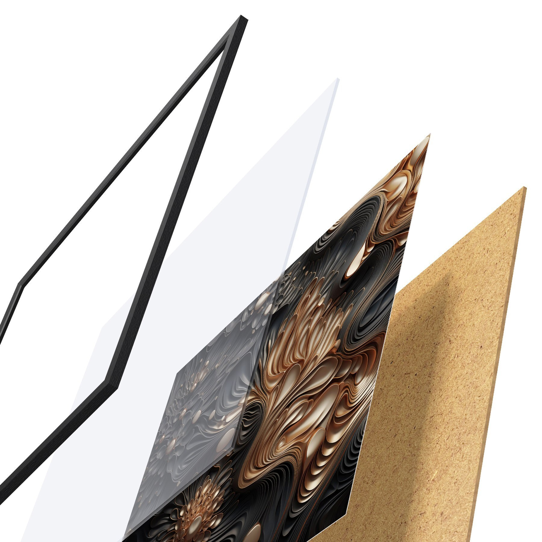 Das Poster besteht aus einem Rahmen, Plexiglas, einem gedruckten Bild und einer Rückwand aus Spanplatten. Dank der Halterungen auf der Rückseite kann das Poster sofort an die Wand gehängt werden.