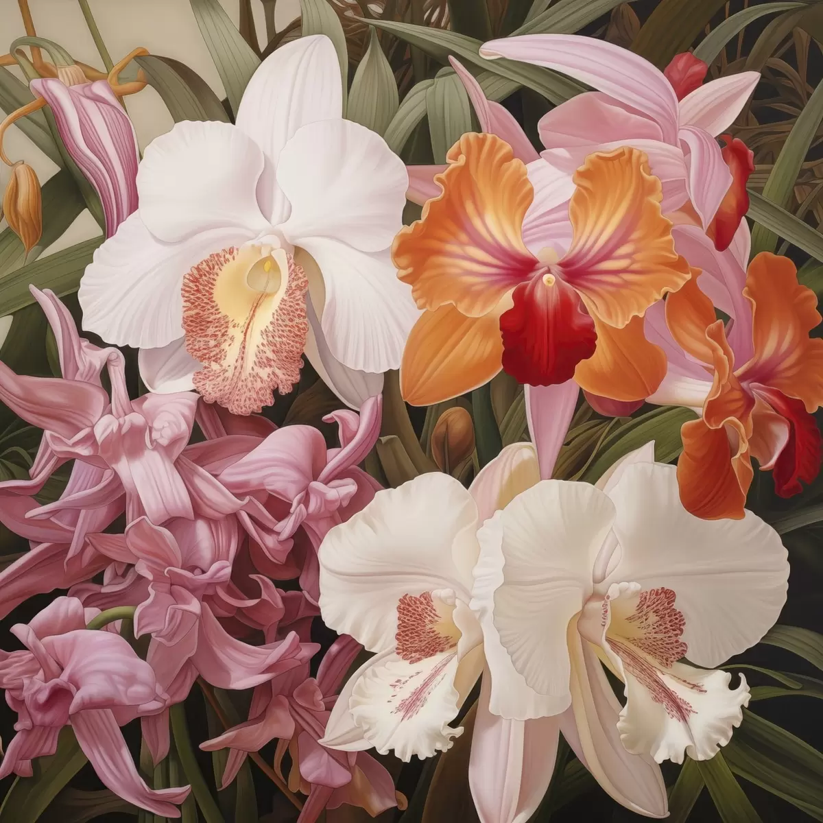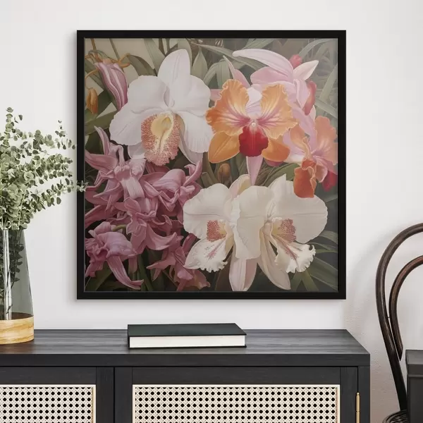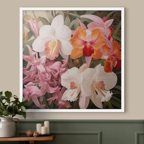 Poster Ein Strauß tropischer Blumen, Orchideen mit grünem Laub im Hintergrund Nr f48385