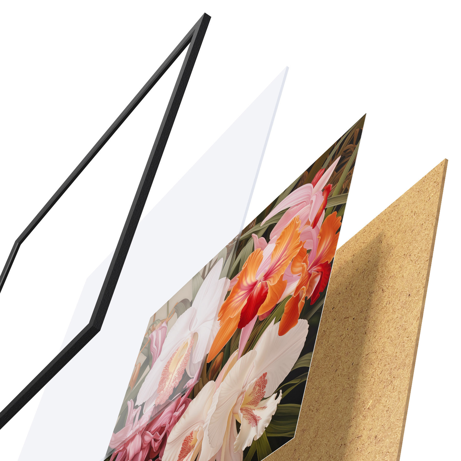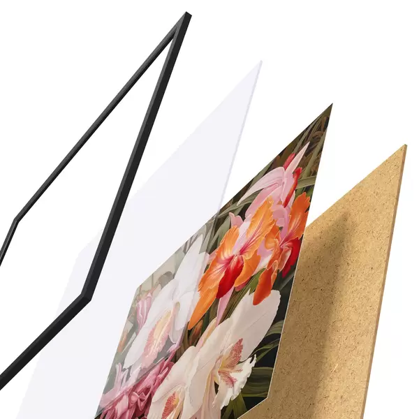 Das Poster besteht aus einem Rahmen, Plexiglas, einem gedruckten Bild und einer Rückwand aus Spanplatten. Dank der Halterungen auf der Rückseite kann das Poster sofort an die Wand gehängt werden.