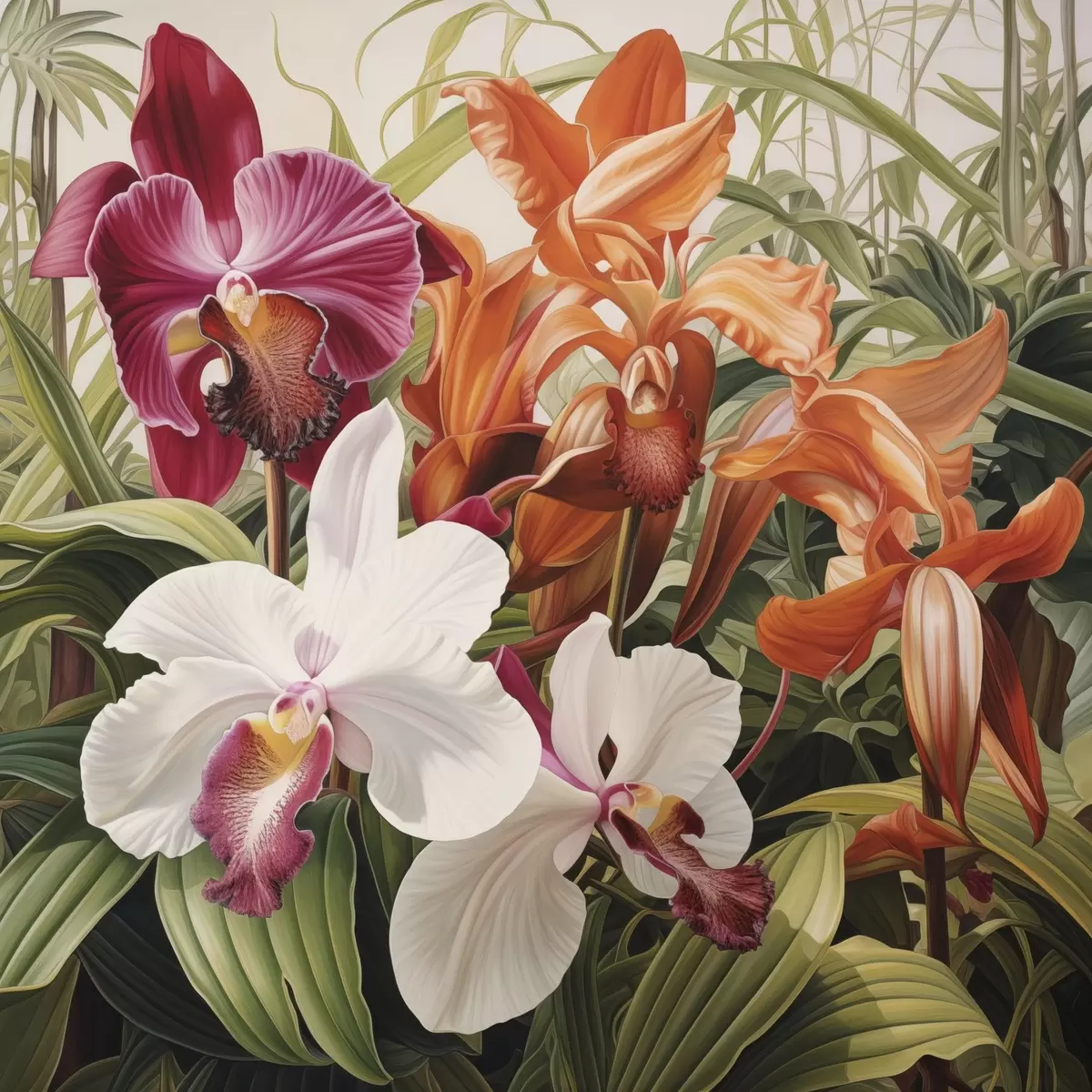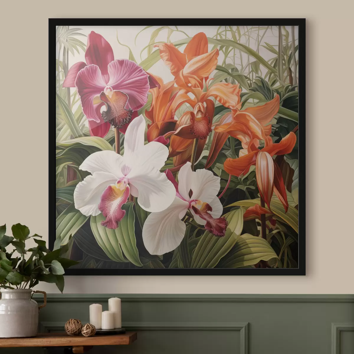 Poster Ein Strauß tropischer Blumen, Orchideen mit grünem Laub im Hintergrund Nr f48386