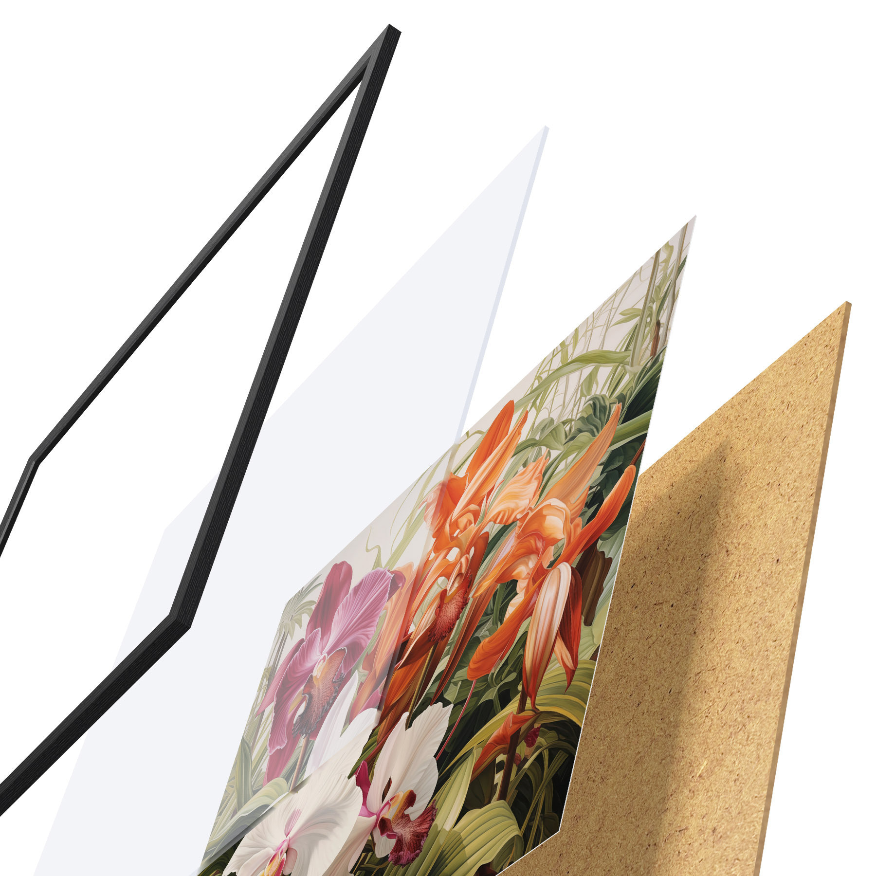 Das Poster besteht aus einem Rahmen, Plexiglas, einem gedruckten Bild und einer Rückwand aus Spanplatten. Dank der Halterungen auf der Rückseite kann das Poster sofort an die Wand gehängt werden.