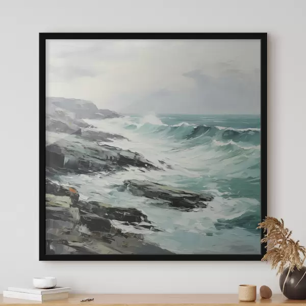 Poster Eine felsige Küstenlandschaft mit Wellen unter bewölktem Himmel, im Stil eines Gemäldes f48387