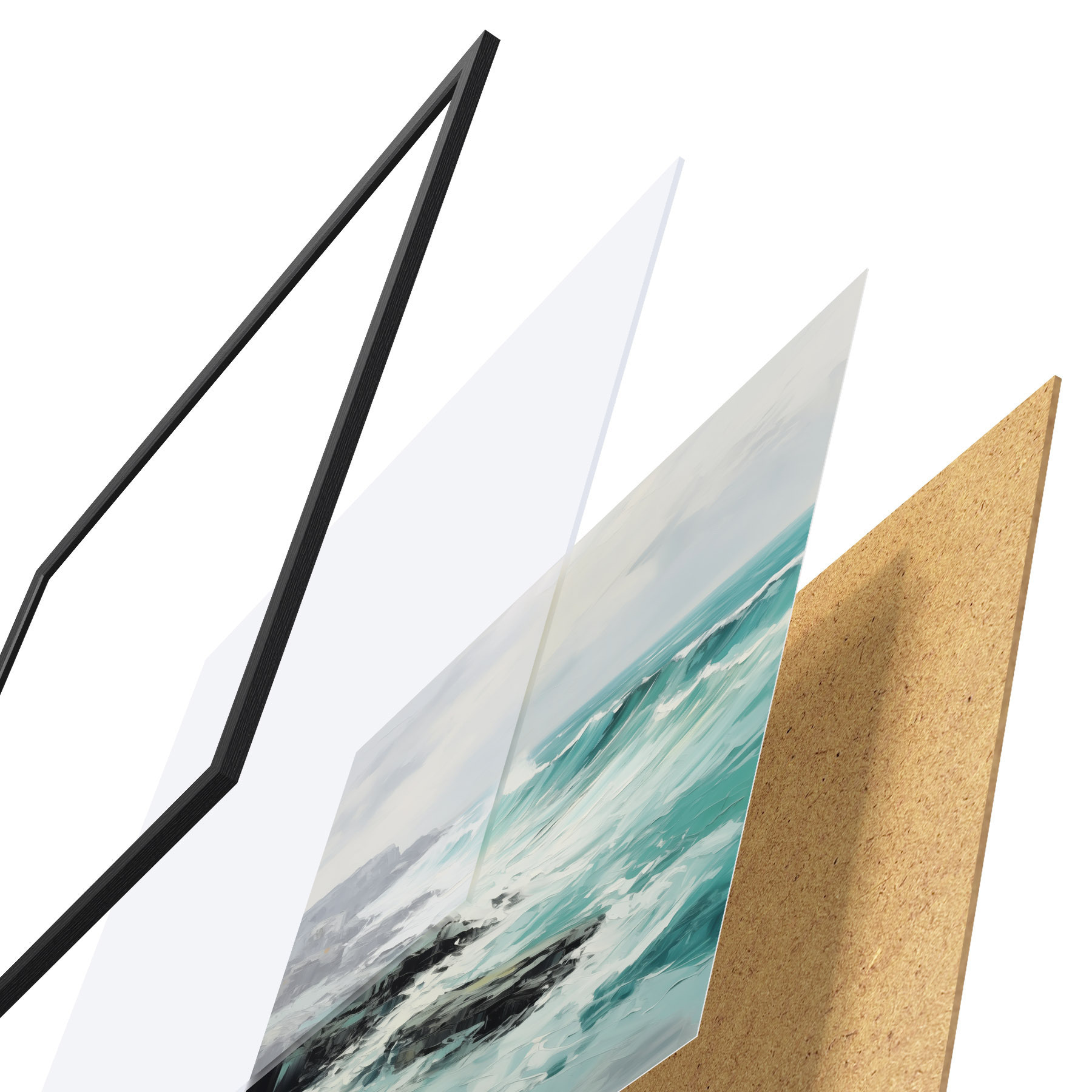 Das Poster besteht aus einem Rahmen, Plexiglas, einem gedruckten Bild und einer Rückwand aus Spanplatten. Dank der Halterungen auf der Rückseite kann das Poster sofort an die Wand gehängt werden.