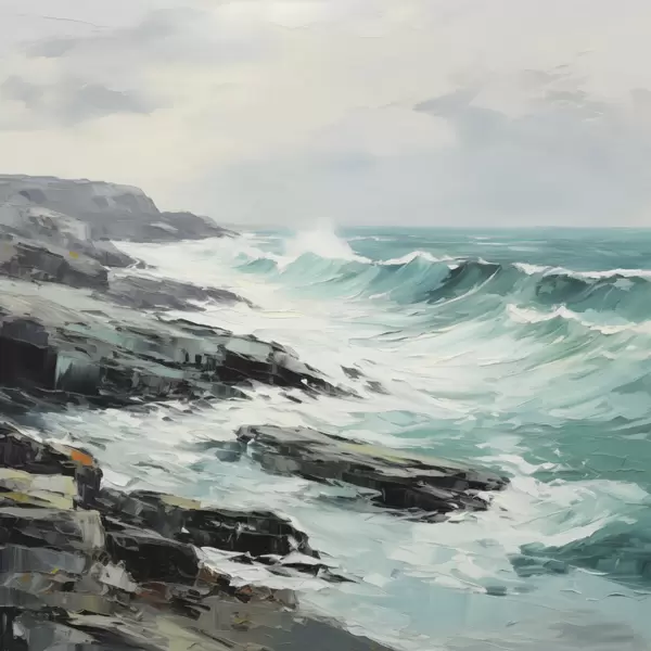 Poster Eine felsige Küstenlandschaft mit Wellen unter bewölktem Himmel, im Stil eines Gemäldes f48387