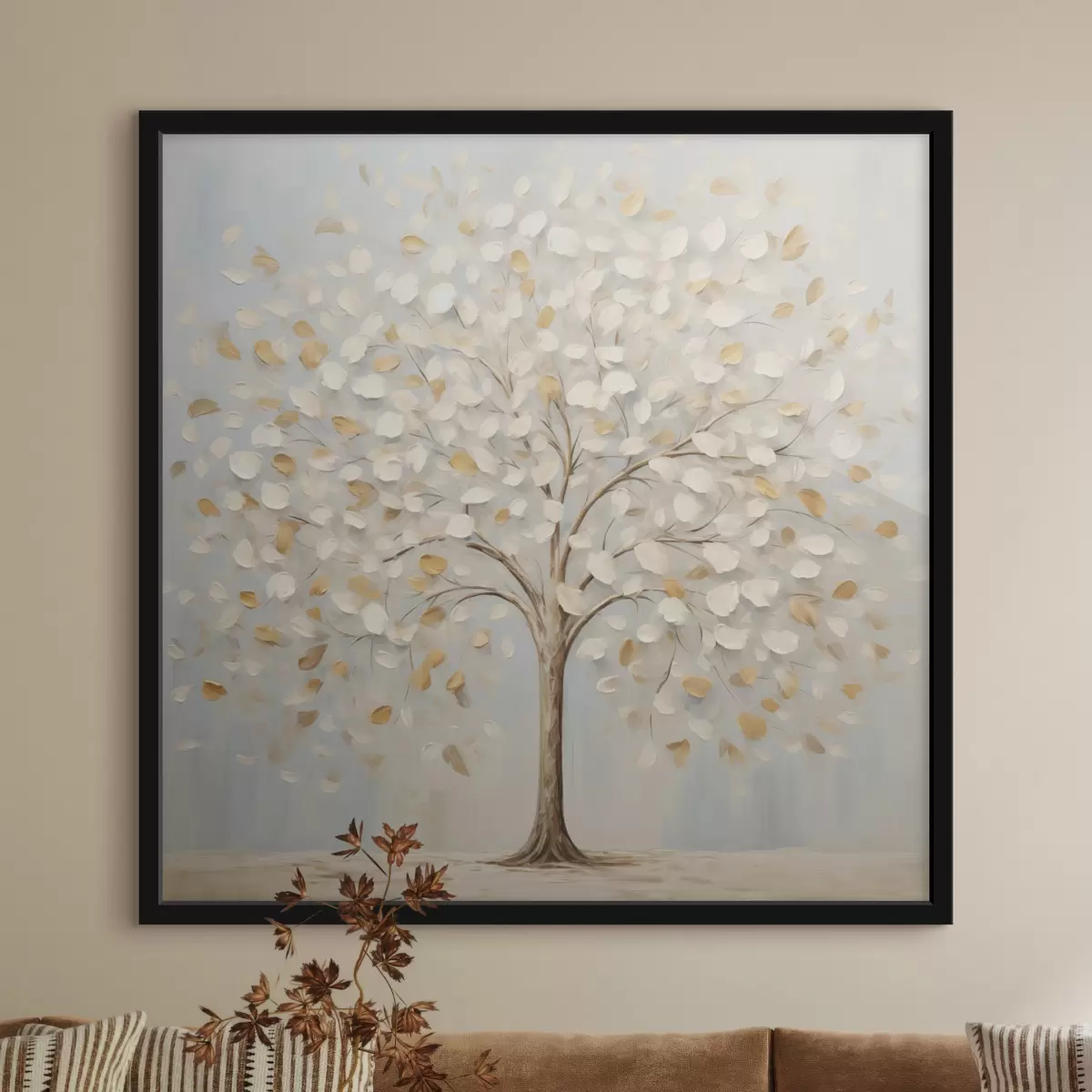 Poster Ein strukturierter Malstil, der einen Baum mit weißen und gelben Blättern vor einem hellblauen Hintergrund darstellt Nr f48391