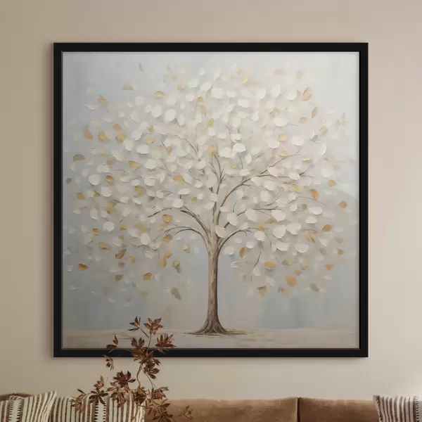 Poster Ein strukturierter Malstil, der einen Baum mit weißen und gelben Blättern vor einem hellblauen Hintergrund darstellt f48391