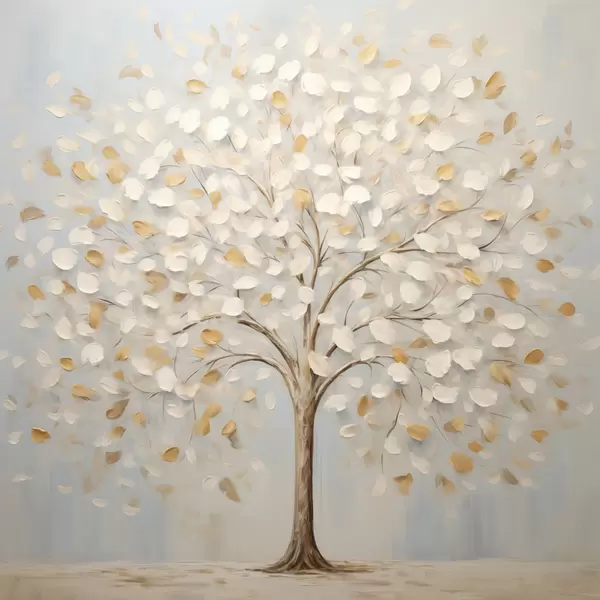 Poster Ein strukturierter Malstil, der einen Baum mit weißen und gelben Blättern vor einem hellblauen Hintergrund darstellt f48391