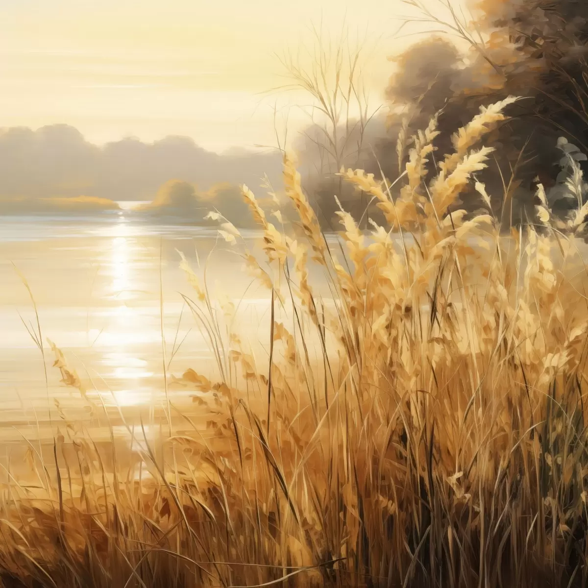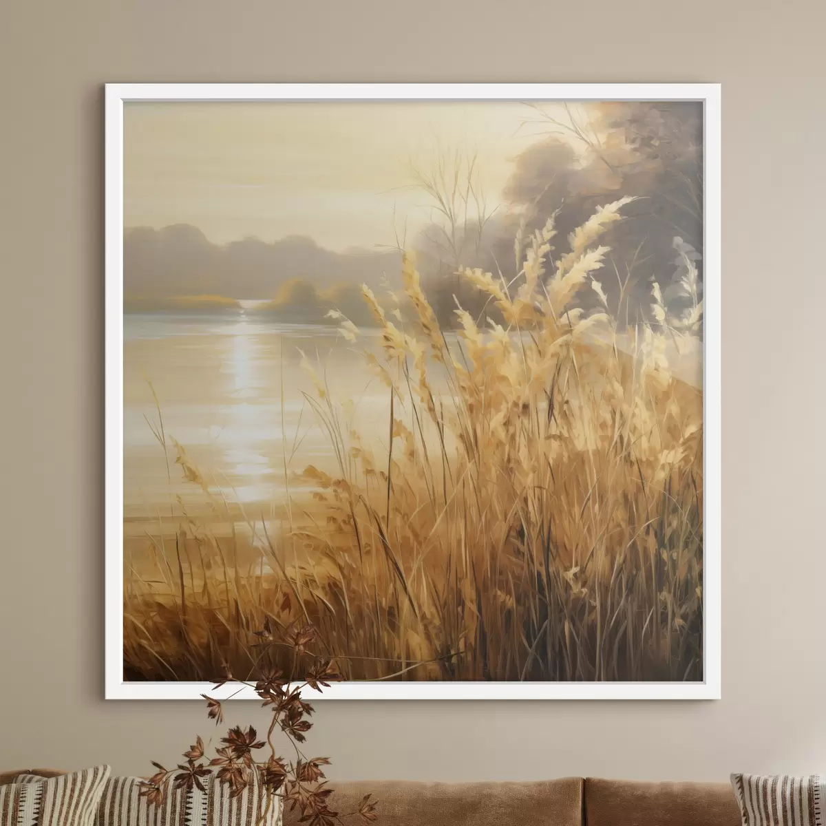 Poster Im Vordergrund hohes, trockenes Gras mit Ährchen, im Hintergrund ein See und Bäume Nr f48393