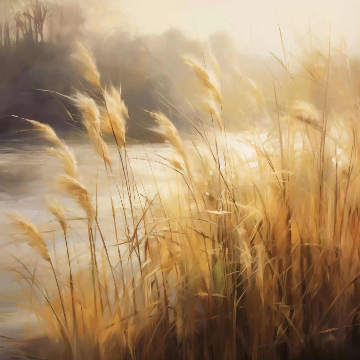 Poster Im Vordergrund hohes, trockenes Gras mit Ährchen, im Hintergrund ein See und Bäume Nr f48394