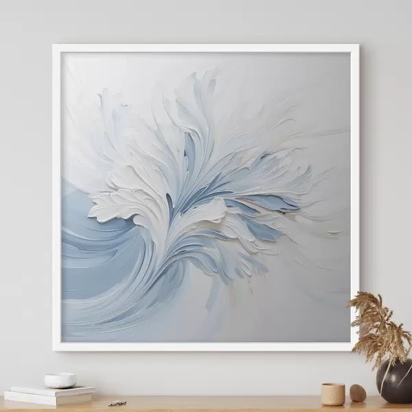 Poster Ein abstraktes Blumenmuster in Weiß und Hellblau mit strukturierten Blütenblättern und geschwungenen Linien Nr f48395