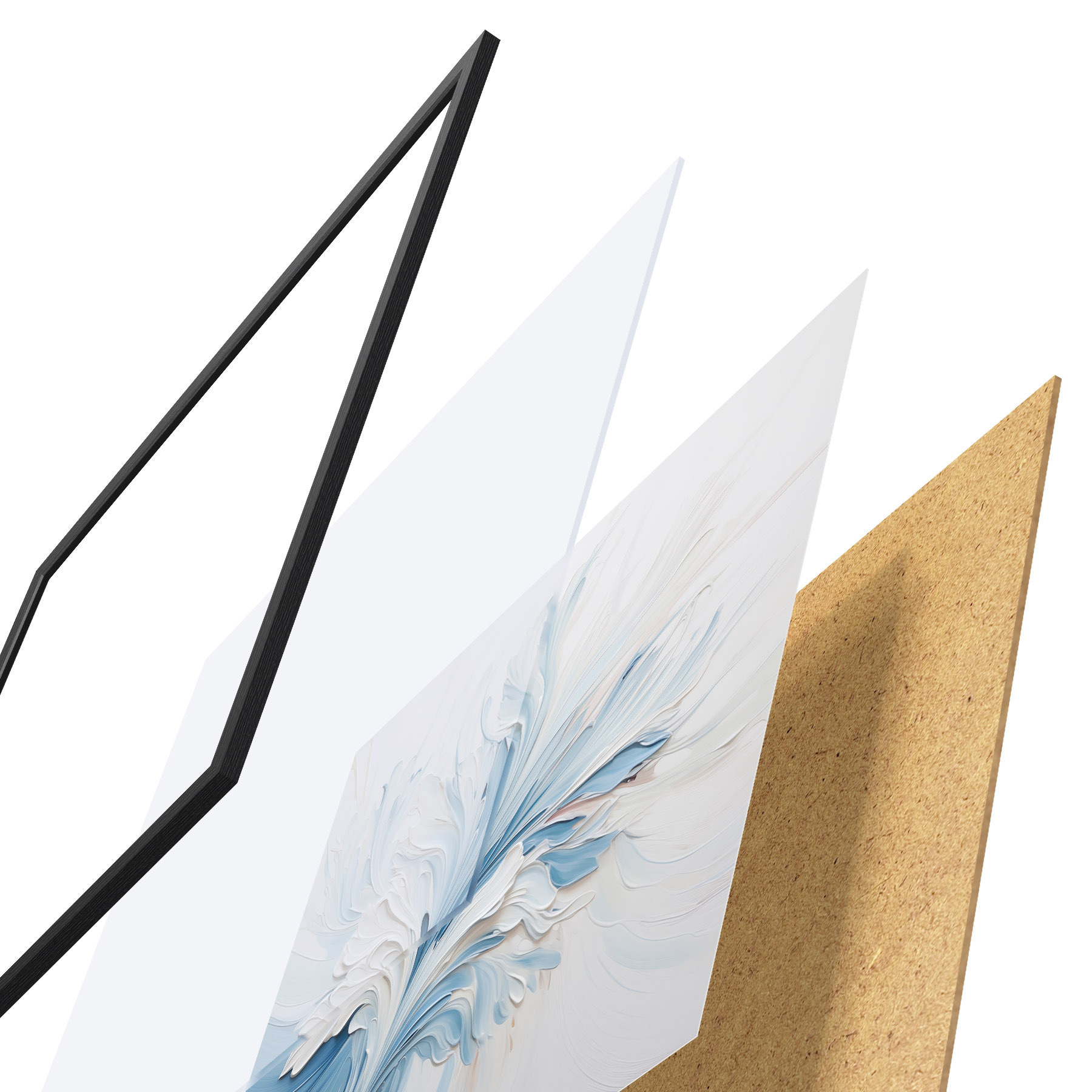 Das Poster besteht aus einem Rahmen, Plexiglas, einem gedruckten Bild und einer Rückwand aus Spanplatten. Dank der Halterungen auf der Rückseite kann das Poster sofort an die Wand gehängt werden.