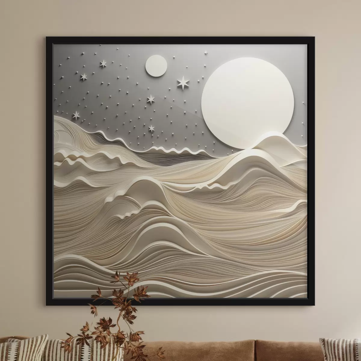 Poster Eine minimalistisch stilisierte Landschaft mit sanften Hügeln und einem großen Mond am Sternenhimmel, abstrakte Kunst Nr f48401