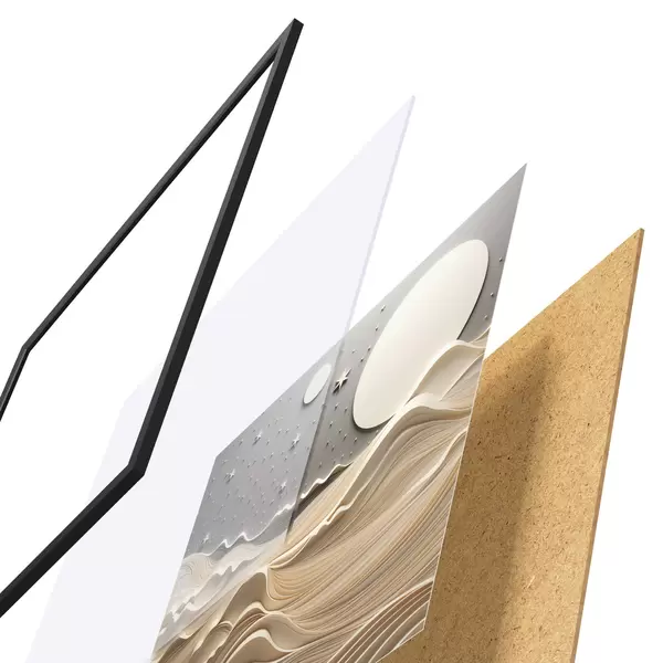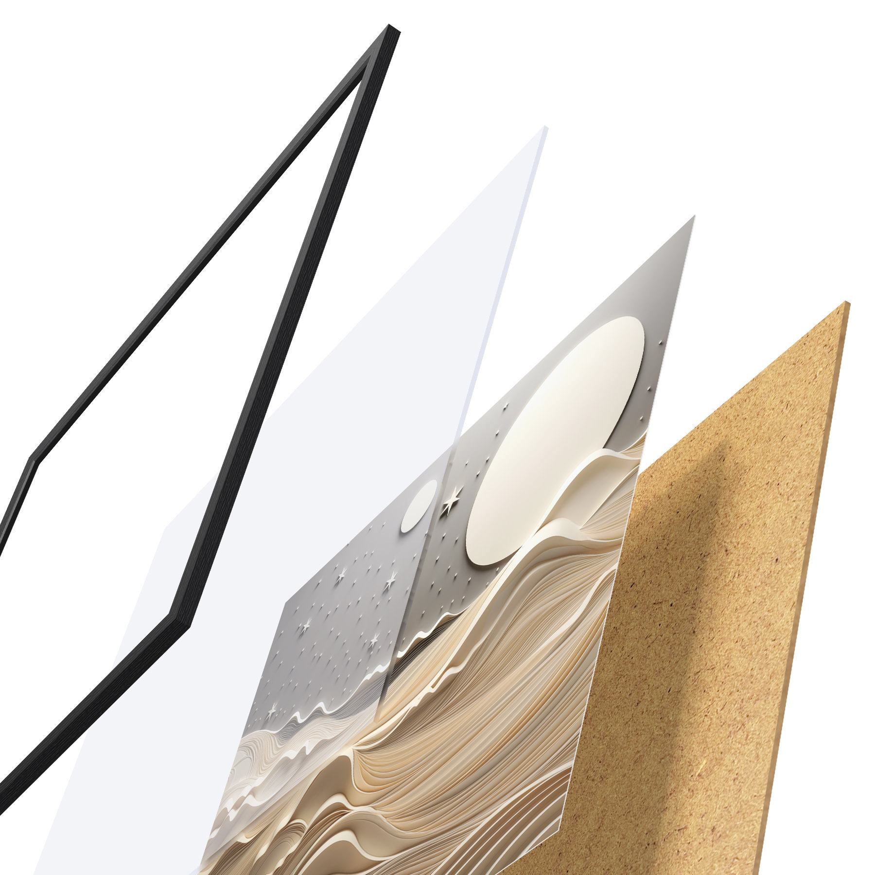 Das Poster besteht aus einem Rahmen, Plexiglas, einem gedruckten Bild und einer Rückwand aus Spanplatten. Dank der Halterungen auf der Rückseite kann das Poster sofort an die Wand gehängt werden.