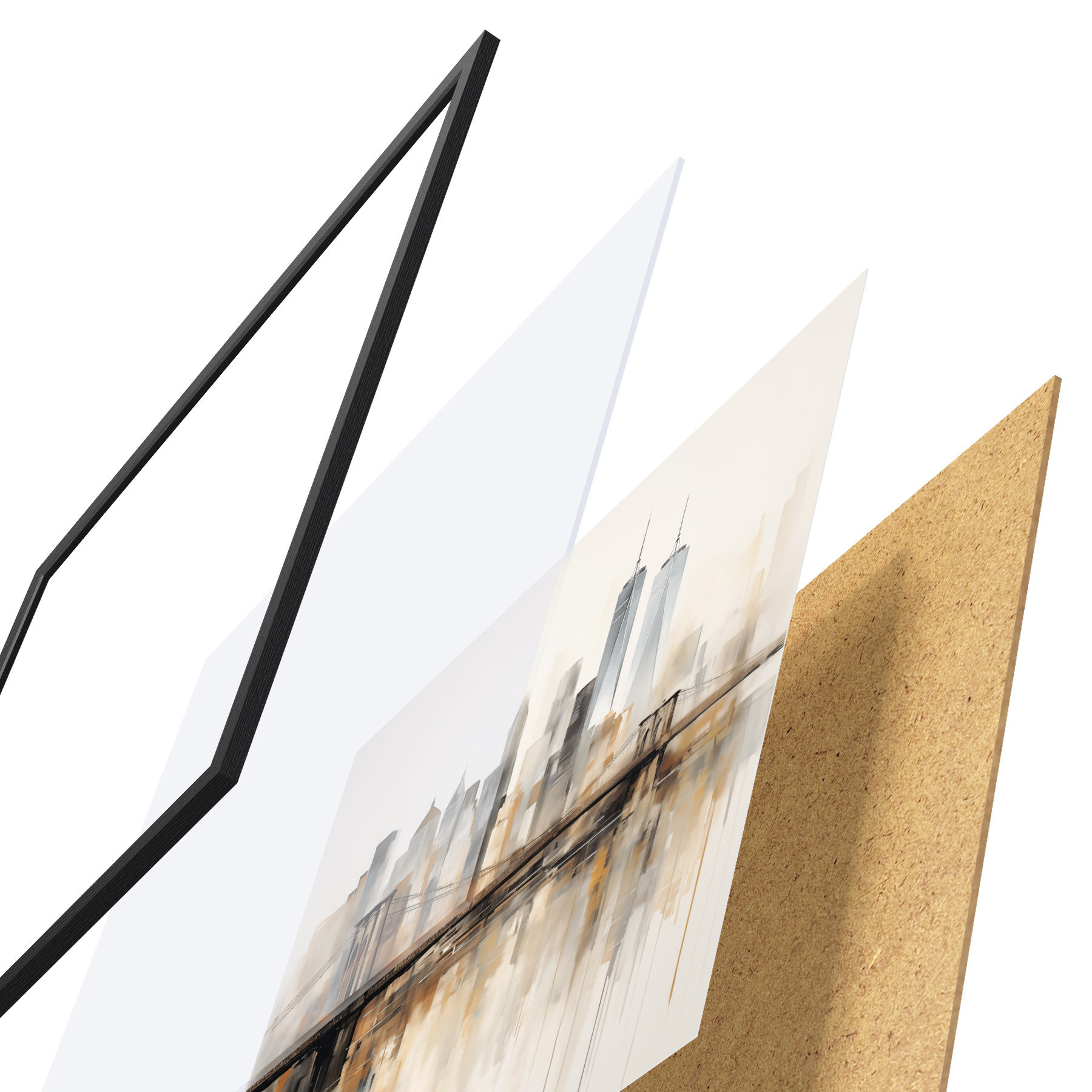 Das Poster besteht aus einem Rahmen, Plexiglas, einem gedruckten Bild und einer Rückwand aus Spanplatten. Dank der Halterungen auf der Rückseite kann das Poster sofort an die Wand gehängt werden.
