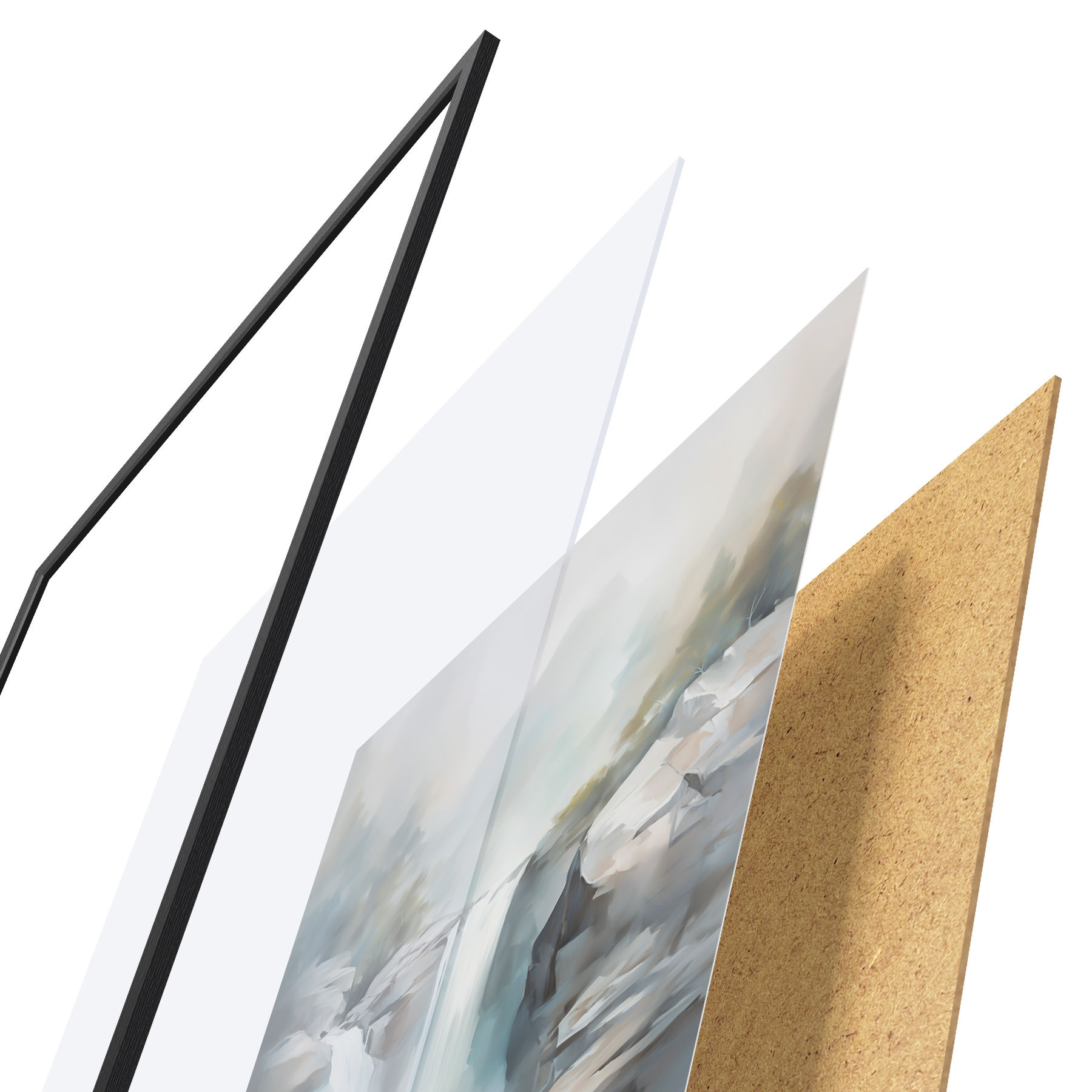 Das Poster besteht aus einem Rahmen, Plexiglas, einem gedruckten Bild und einer Rückwand aus Spanplatten. Dank der Halterungen auf der Rückseite kann das Poster sofort an die Wand gehängt werden.