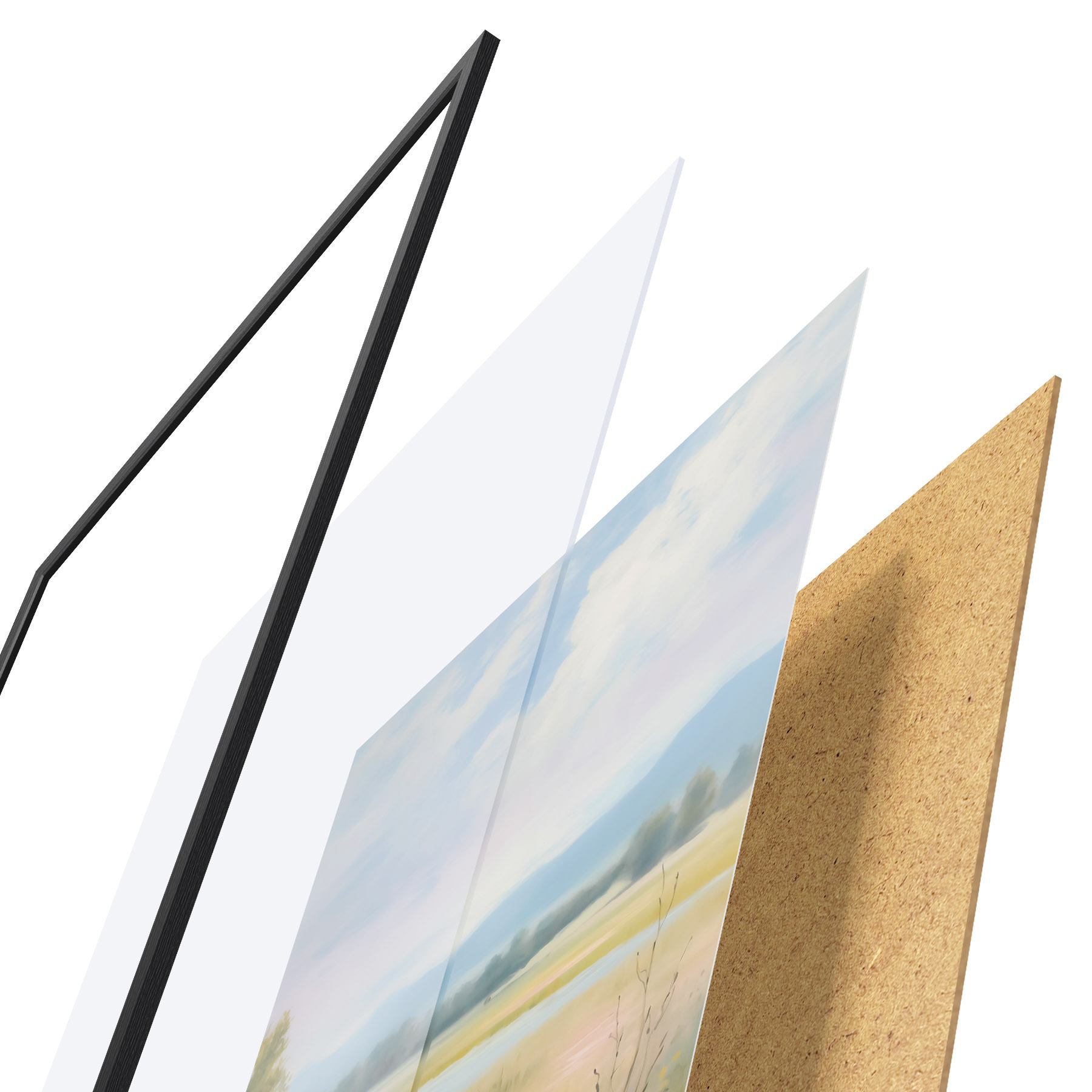 Das Poster besteht aus einem Rahmen, Plexiglas, einem gedruckten Bild und einer Rückwand aus Spanplatten. Dank der Halterungen auf der Rückseite kann das Poster sofort an die Wand gehängt werden.