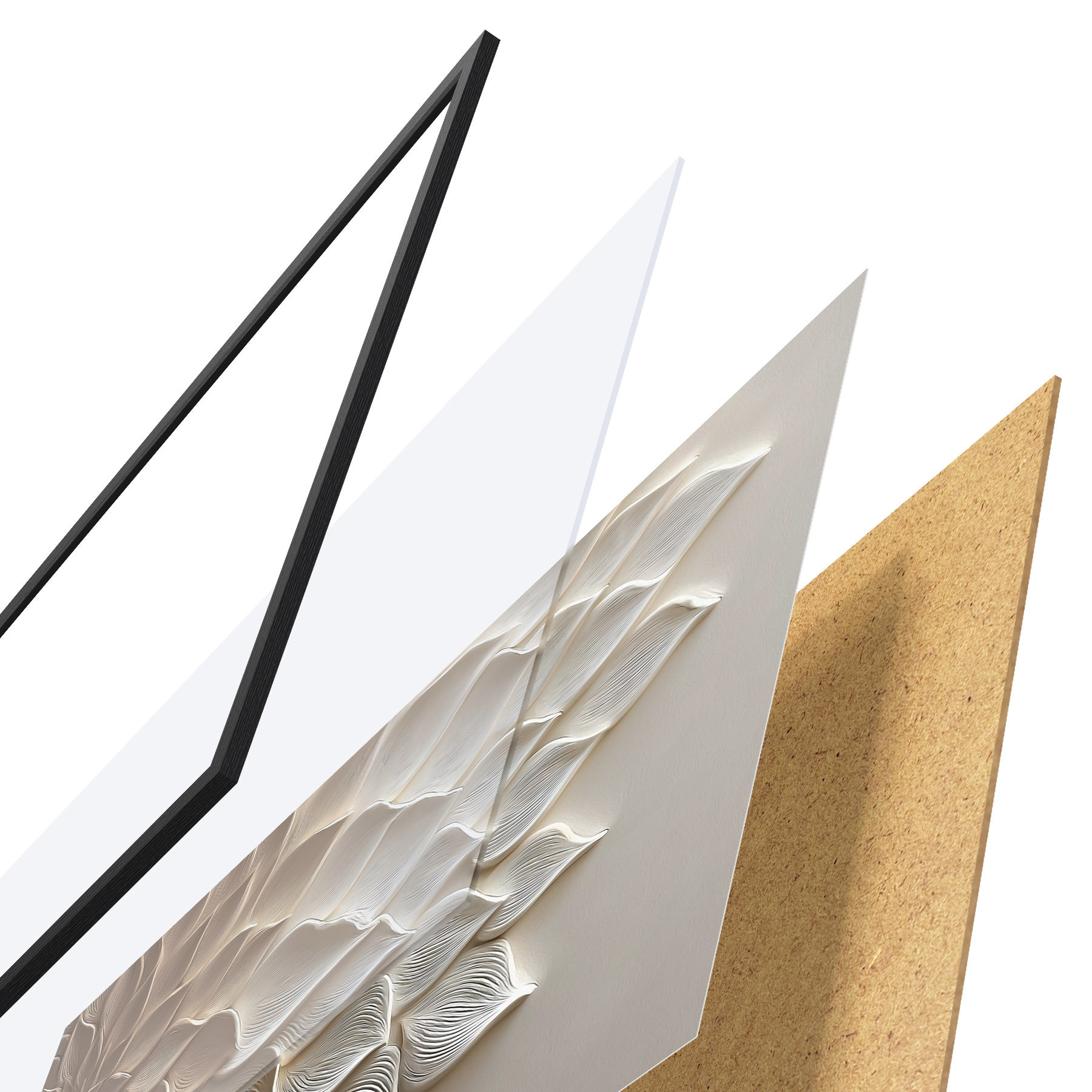 Das Poster besteht aus einem Rahmen, Plexiglas, einem gedruckten Bild und einer Rückwand aus Spanplatten. Dank der Halterungen auf der Rückseite kann das Poster sofort an die Wand gehängt werden.