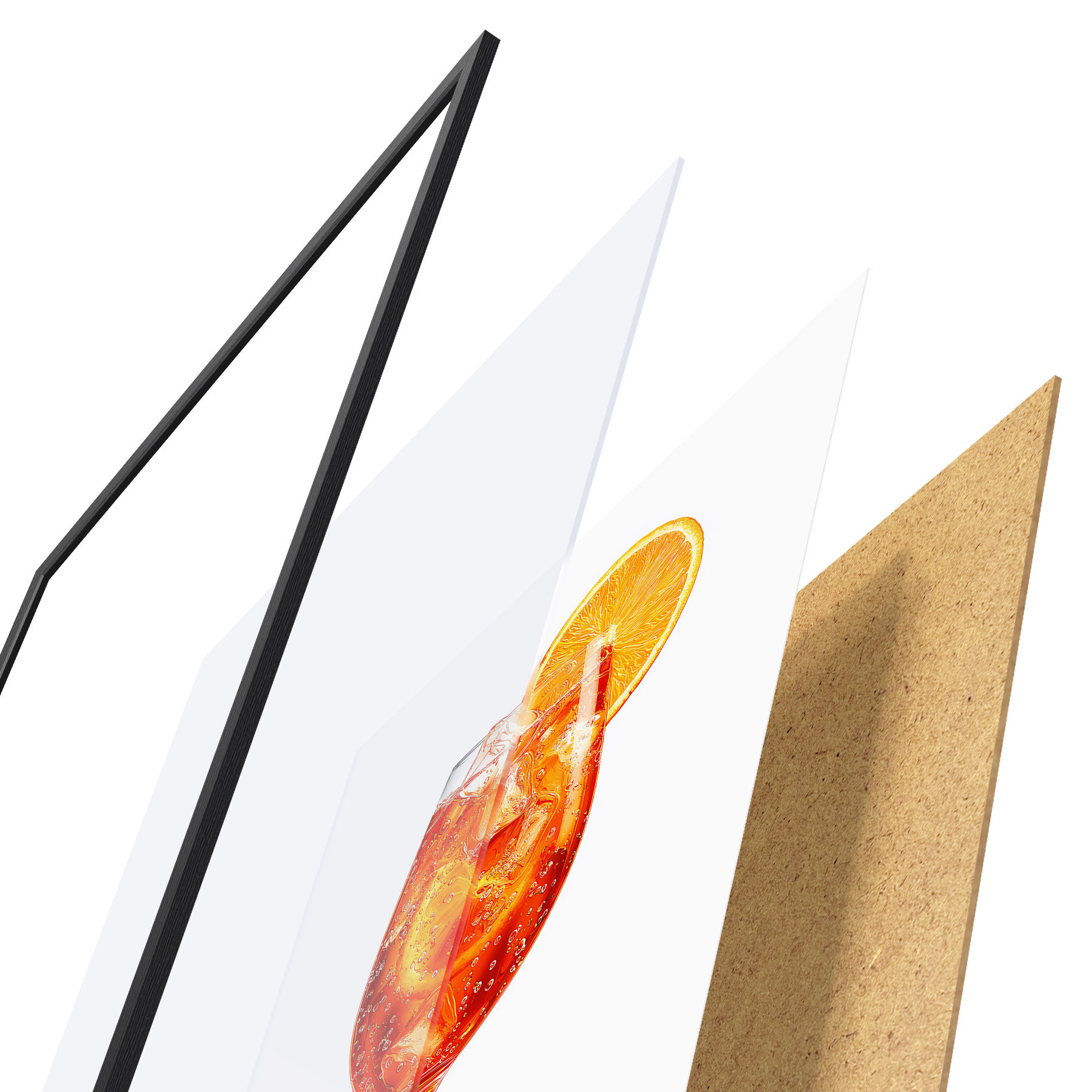 Das Poster besteht aus einem Rahmen, Plexiglas, einem gedruckten Bild und einer Rückwand aus Spanplatten. Dank der Halterungen auf der Rückseite kann das Poster sofort an die Wand gehängt werden.