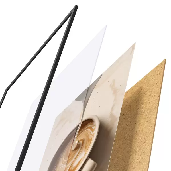 Das Poster besteht aus einem Rahmen, Plexiglas, einem gedruckten Bild und einer Rückwand aus Spanplatten. Dank der Halterungen auf der Rückseite kann das Poster sofort an die Wand gehängt werden.