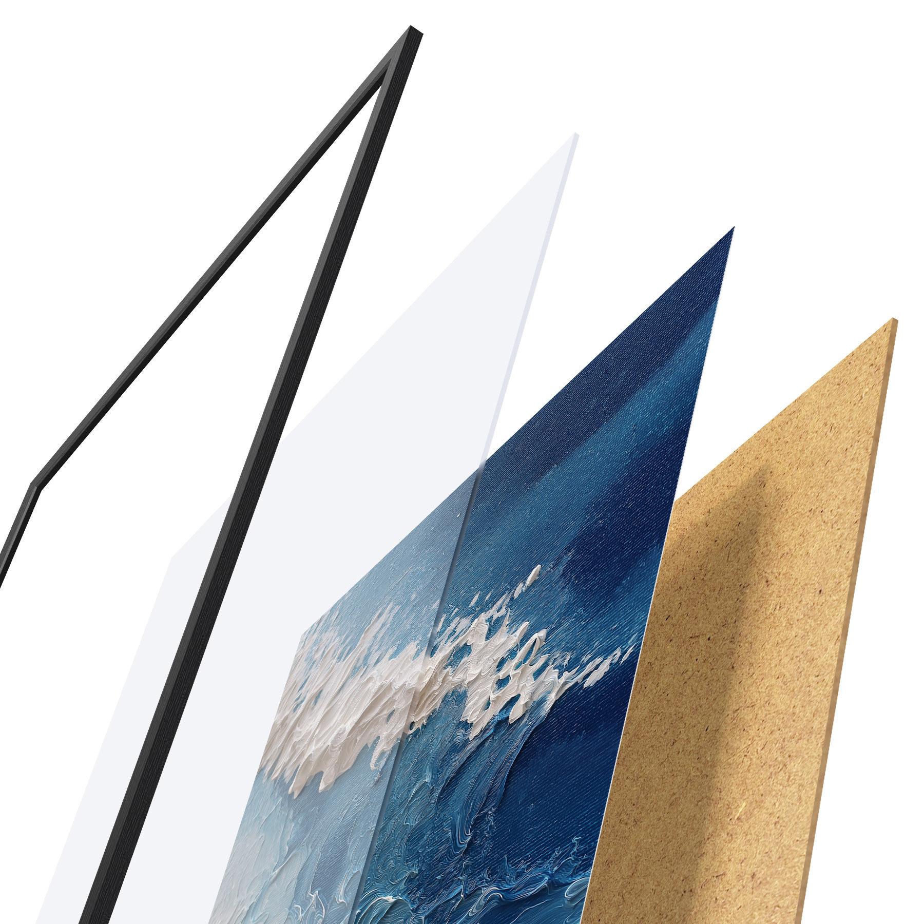Das Poster besteht aus einem Rahmen, Plexiglas, einem gedruckten Bild und einer Rückwand aus Spanplatten. Dank der Halterungen auf der Rückseite kann das Poster sofort an die Wand gehängt werden.