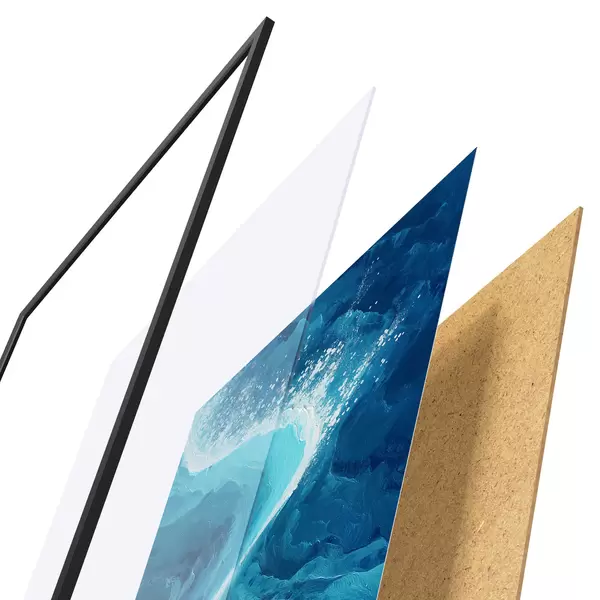 Das Poster besteht aus einem Rahmen, Plexiglas, einem gedruckten Bild und einer Rückwand aus Spanplatten. Dank der Halterungen auf der Rückseite kann das Poster sofort an die Wand gehängt werden.