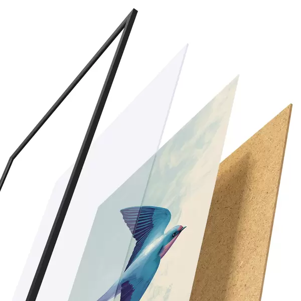Das Poster besteht aus einem Rahmen, Plexiglas, einem gedruckten Bild und einer Rückwand aus Spanplatten. Dank der Halterungen auf der Rückseite kann das Poster sofort an die Wand gehängt werden.
