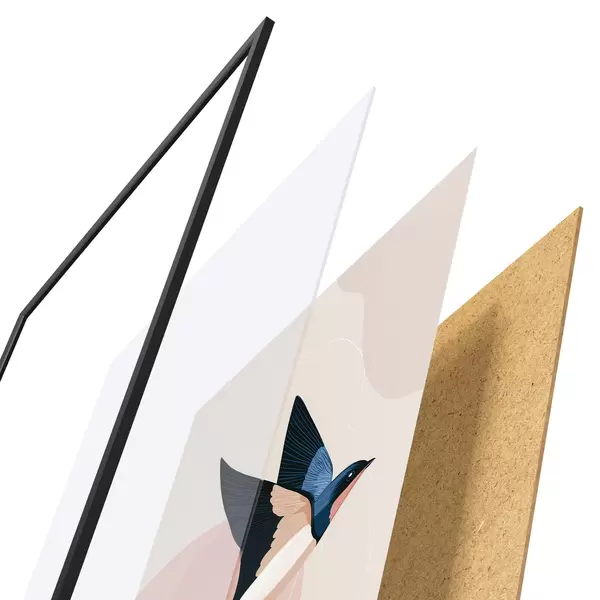 Das Poster besteht aus einem Rahmen, Plexiglas, einem gedruckten Bild und einer Rückwand aus Spanplatten. Dank der Halterungen auf der Rückseite kann das Poster sofort an die Wand gehängt werden.