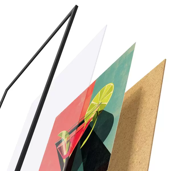 Das Poster besteht aus einem Rahmen, Plexiglas, einem gedruckten Bild und einer Rückwand aus Spanplatten. Dank der Halterungen auf der Rückseite kann das Poster sofort an die Wand gehängt werden.