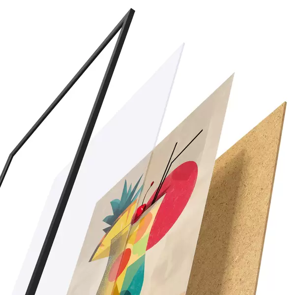 Das Poster besteht aus einem Rahmen, Plexiglas, einem gedruckten Bild und einer Rückwand aus Spanplatten. Dank der Halterungen auf der Rückseite kann das Poster sofort an die Wand gehängt werden.