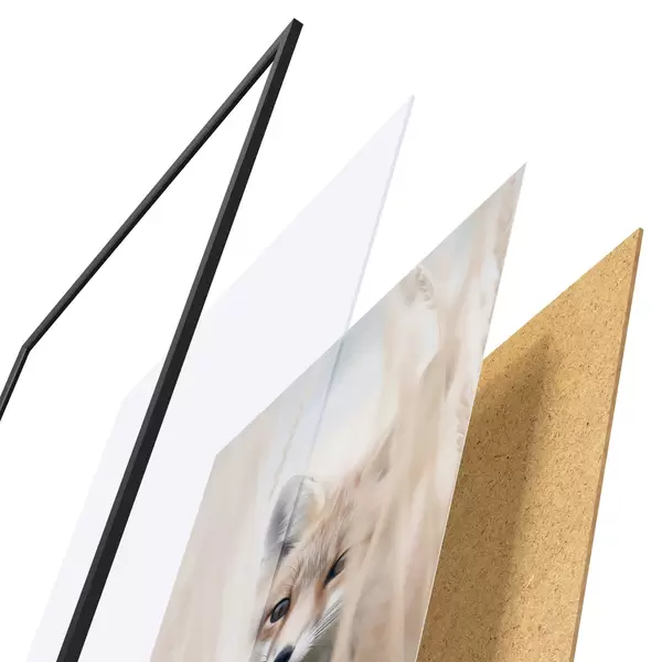 Das Poster besteht aus einem Rahmen, Plexiglas, einem gedruckten Bild und einer Rückwand aus Spanplatten. Dank der Halterungen auf der Rückseite kann das Poster sofort an die Wand gehängt werden.