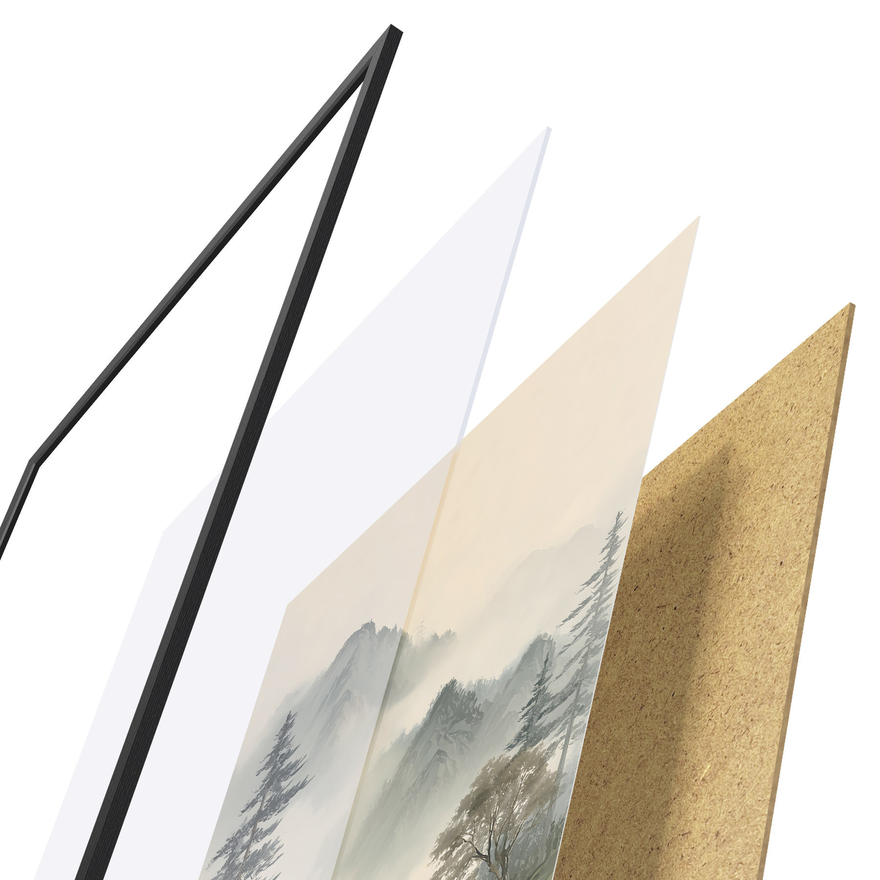 Das Poster besteht aus einem Rahmen, Plexiglas, einem gedruckten Bild und einer Rückwand aus Spanplatten. Dank der Halterungen auf der Rückseite kann das Poster sofort an die Wand gehängt werden.