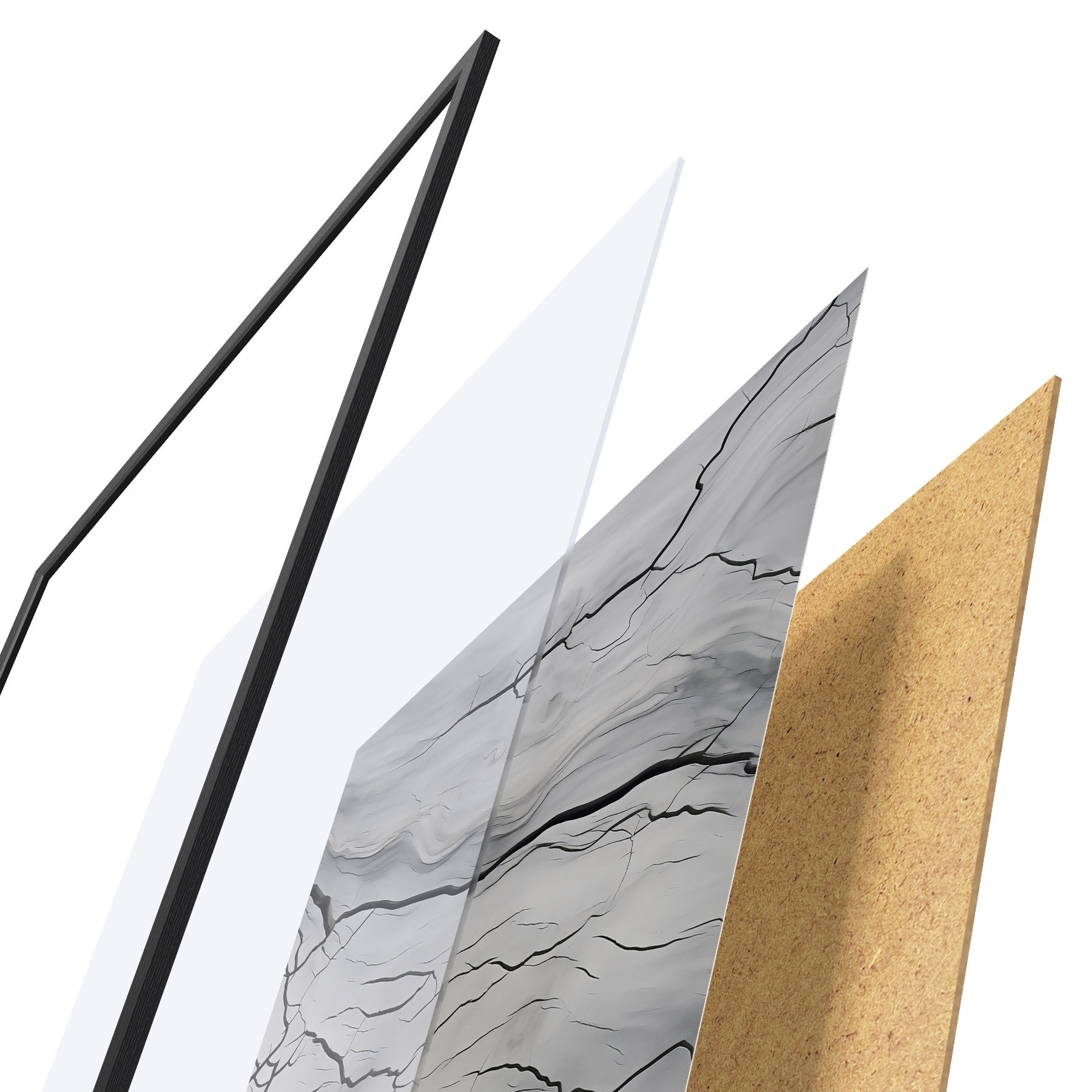 Das Poster besteht aus einem Rahmen, Plexiglas, einem gedruckten Bild und einer Rückwand aus Spanplatten. Dank der Halterungen auf der Rückseite kann das Poster sofort an die Wand gehängt werden.
