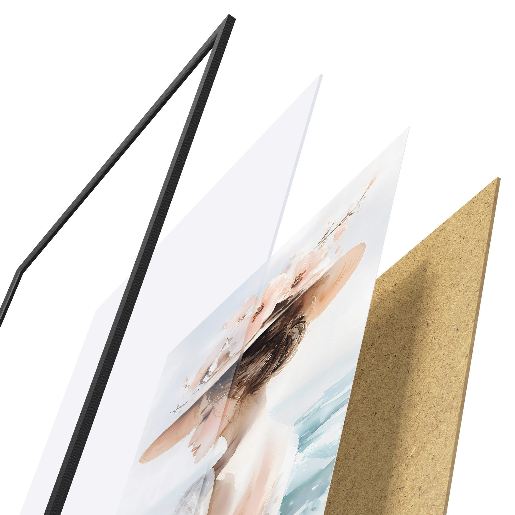 Das Poster besteht aus einem Rahmen, Plexiglas, einem gedruckten Bild und einer Rückwand aus Spanplatten. Dank der Halterungen auf der Rückseite kann das Poster sofort an die Wand gehängt werden.