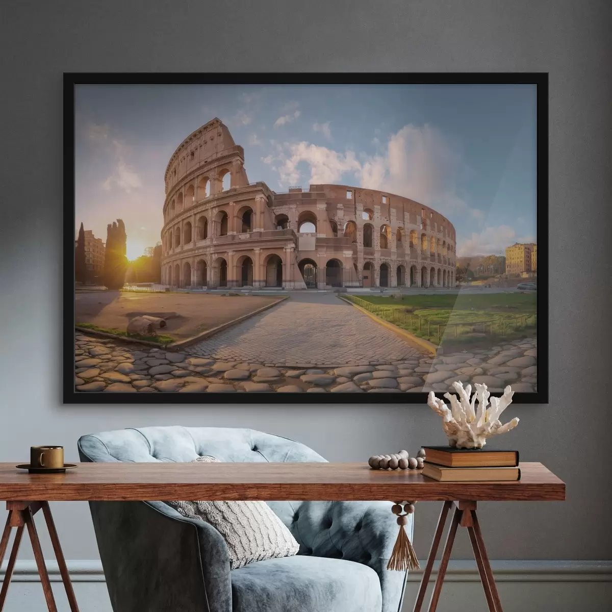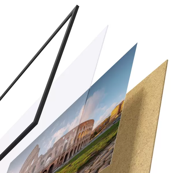 Das Poster besteht aus einem Rahmen, Plexiglas, einem gedruckten Bild und einer Rückwand aus Spanplatten. Dank der Halterungen auf der Rückseite kann das Poster sofort an die Wand gehängt werden.