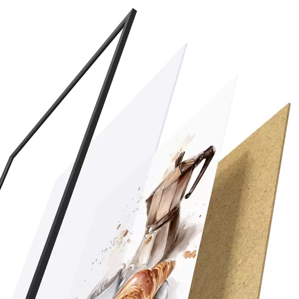 Das Poster besteht aus einem Rahmen, Plexiglas, einem gedruckten Bild und einer Rückwand aus Spanplatten. Dank der Halterungen auf der Rückseite kann das Poster sofort an die Wand gehängt werden.