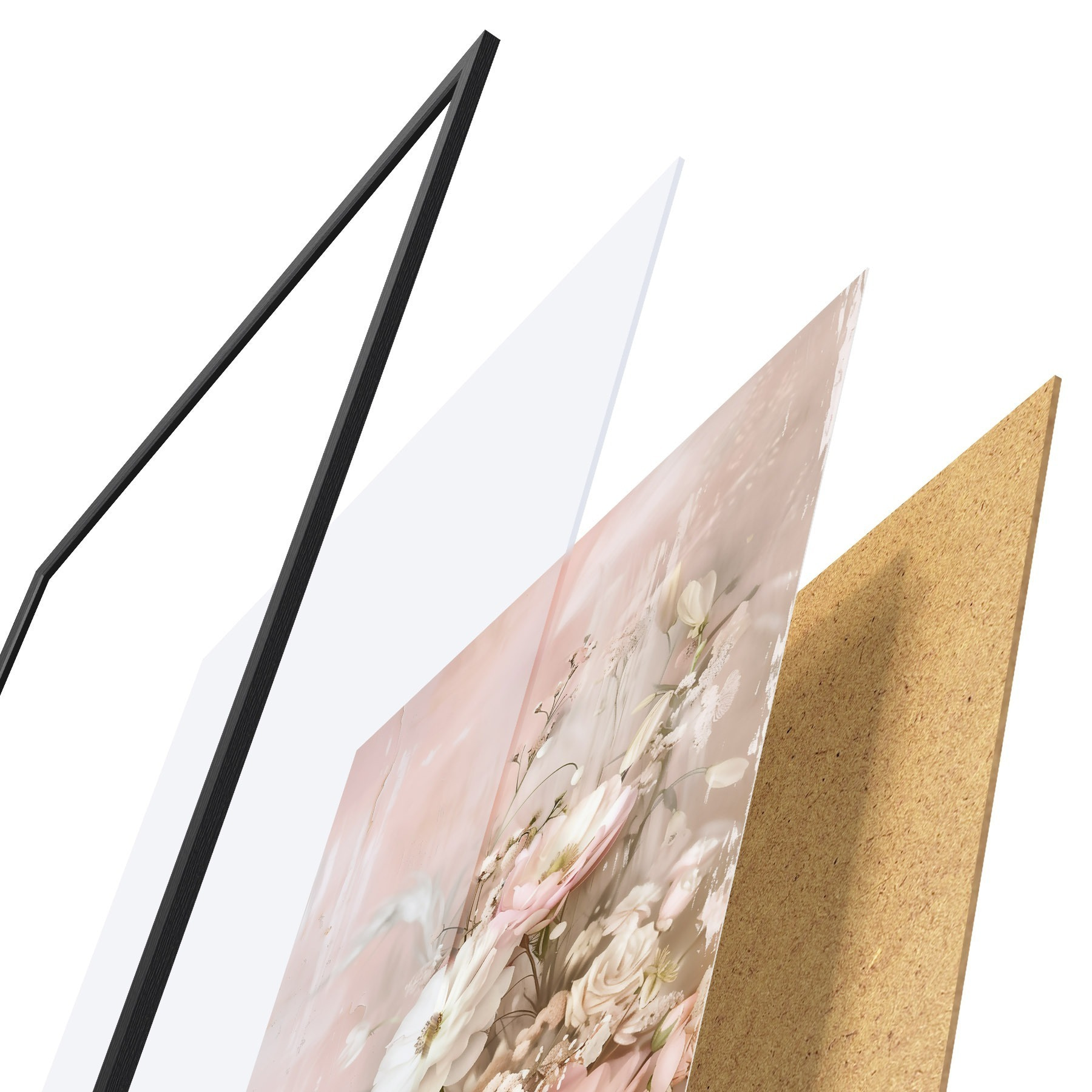 Das Poster besteht aus einem Rahmen, Plexiglas, einem gedruckten Bild und einer Rückwand aus Spanplatten. Dank der Halterungen auf der Rückseite kann das Poster sofort an die Wand gehängt werden.