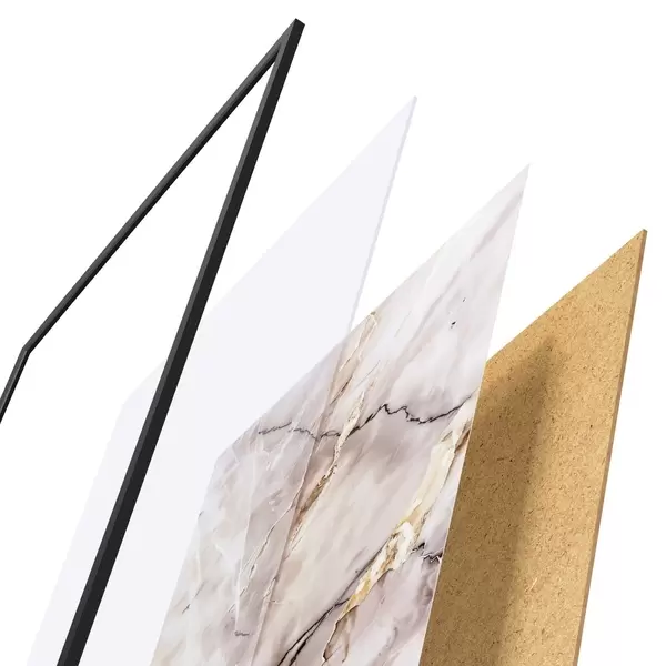 Das Poster besteht aus einem Rahmen, Plexiglas, einem gedruckten Bild und einer Rückwand aus Spanplatten. Dank der Halterungen auf der Rückseite kann das Poster sofort an die Wand gehängt werden.