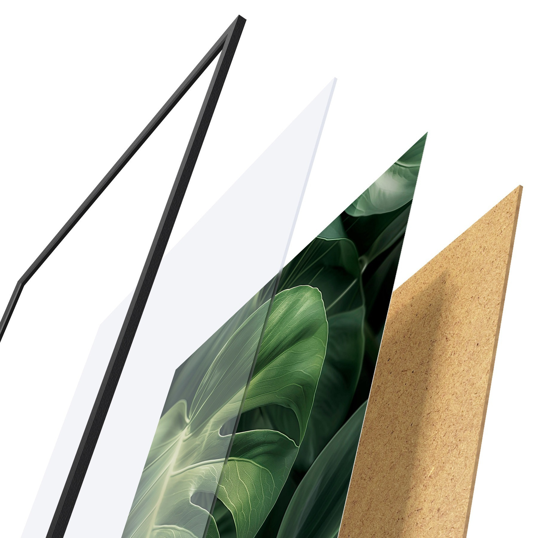 Das Poster besteht aus einem Rahmen, Plexiglas, einem gedruckten Bild und einer Rückwand aus Spanplatten. Dank der Halterungen auf der Rückseite kann das Poster sofort an die Wand gehängt werden.