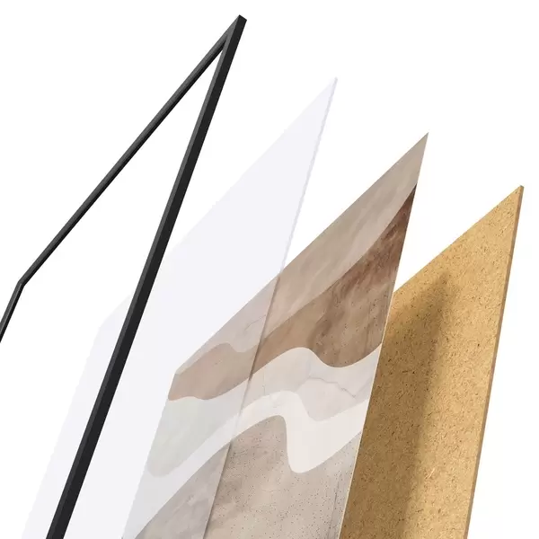 Das Poster besteht aus einem Rahmen, Plexiglas, einem gedruckten Bild und einer Rückwand aus Spanplatten. Dank der Halterungen auf der Rückseite kann das Poster sofort an die Wand gehängt werden.