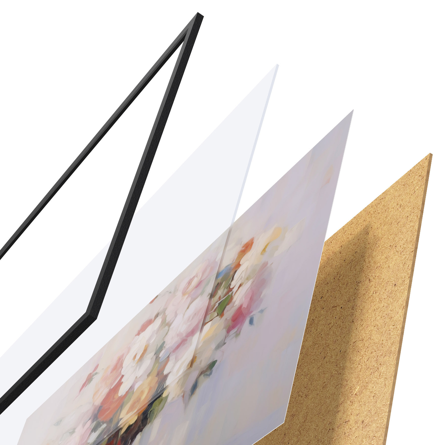 Das Poster besteht aus einem Rahmen, Plexiglas, einem gedruckten Bild und einer Rückwand aus Spanplatten. Dank der Halterungen auf der Rückseite kann das Poster sofort an die Wand gehängt werden.