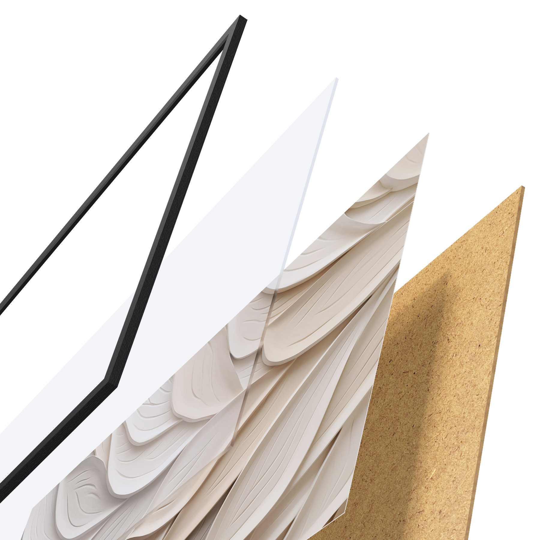 Das Poster besteht aus einem Rahmen, Plexiglas, einem gedruckten Bild und einer Rückwand aus Spanplatten. Dank der Halterungen auf der Rückseite kann das Poster sofort an die Wand gehängt werden.